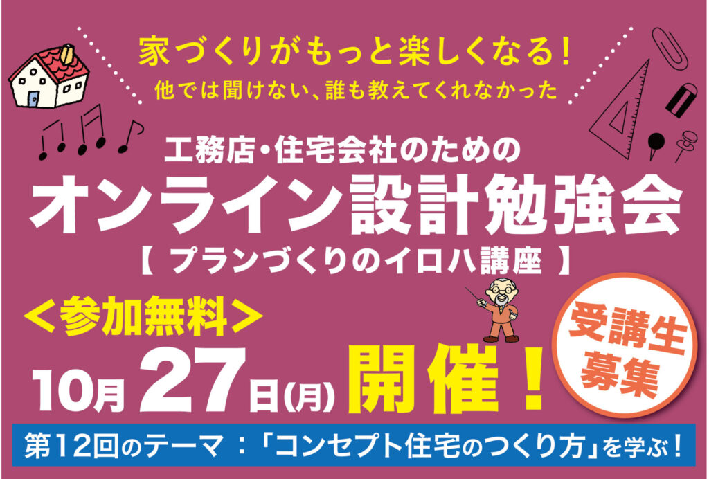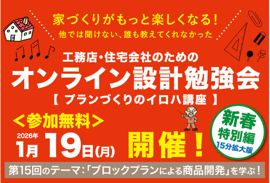 一から学び、設計ノウハウを体系的に習得するプランづくり研修。『構造安定』×『スピードUP』×『整った外観デザイン』×『コストダウン』を実現する、ブロックプラン手法による論理的な【プランのつくり方】を学びます。